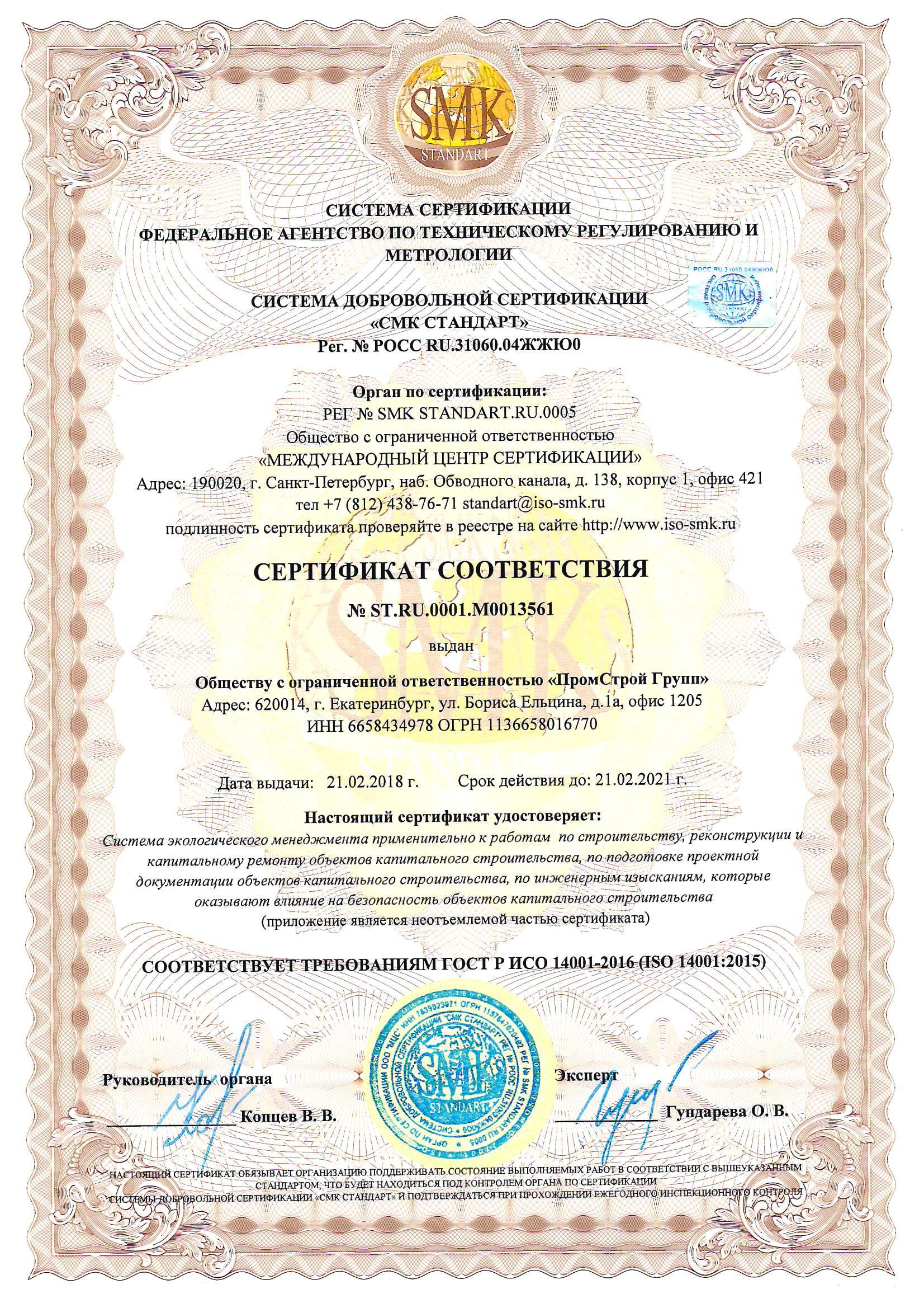 Мы гарантируем высочайшее качество строительных услуг. Персонал ООО «ПромСтрой Групп» своевременно повышает уровень квалификации и знаний. В том числе, принята система менеджмента качества ISO 9001:2015, система менеджмента безопасности труда и охраны здоровья OHSAS 18001:2007, система экологического менеджмента ISO 14001:2015.